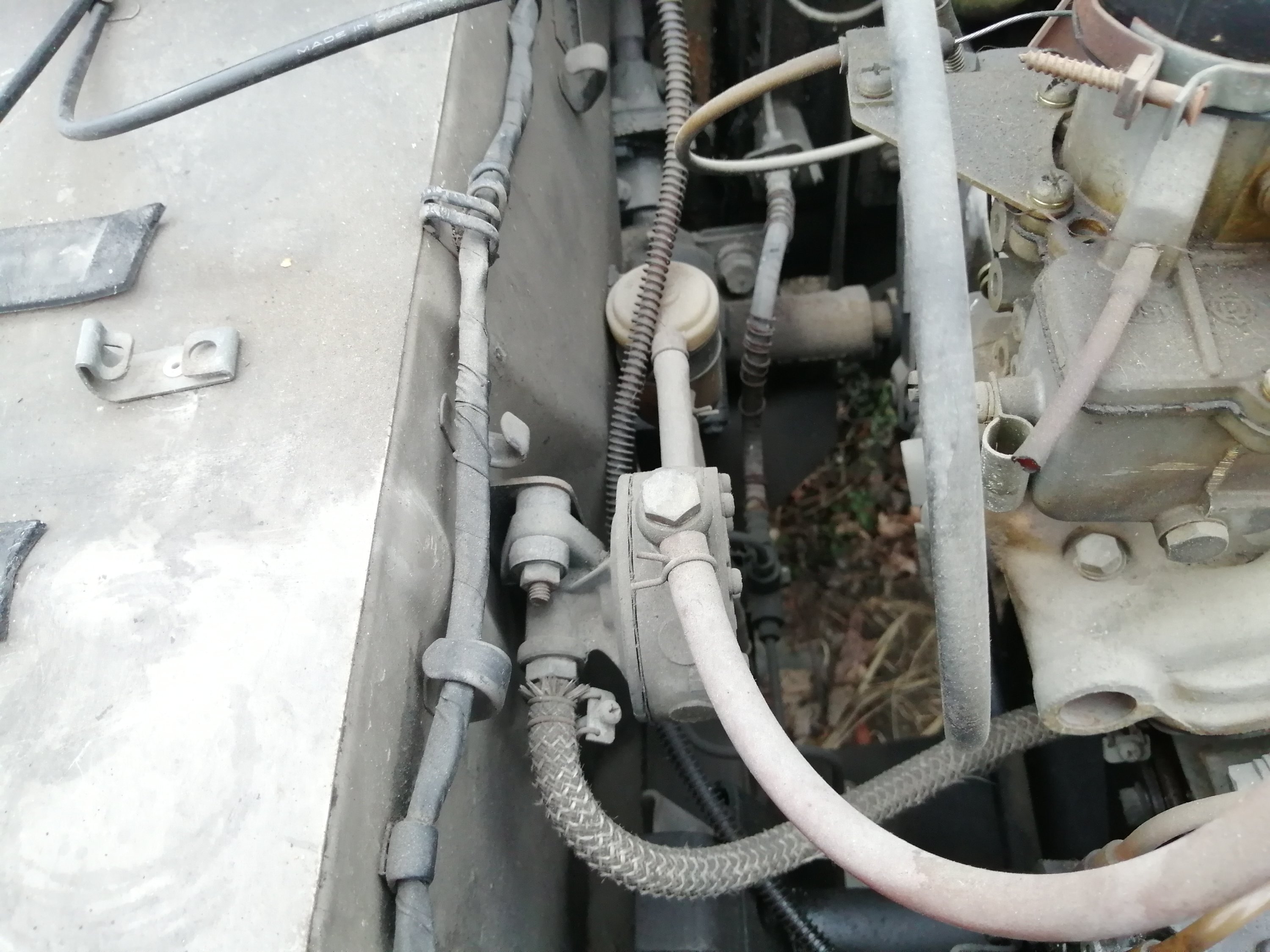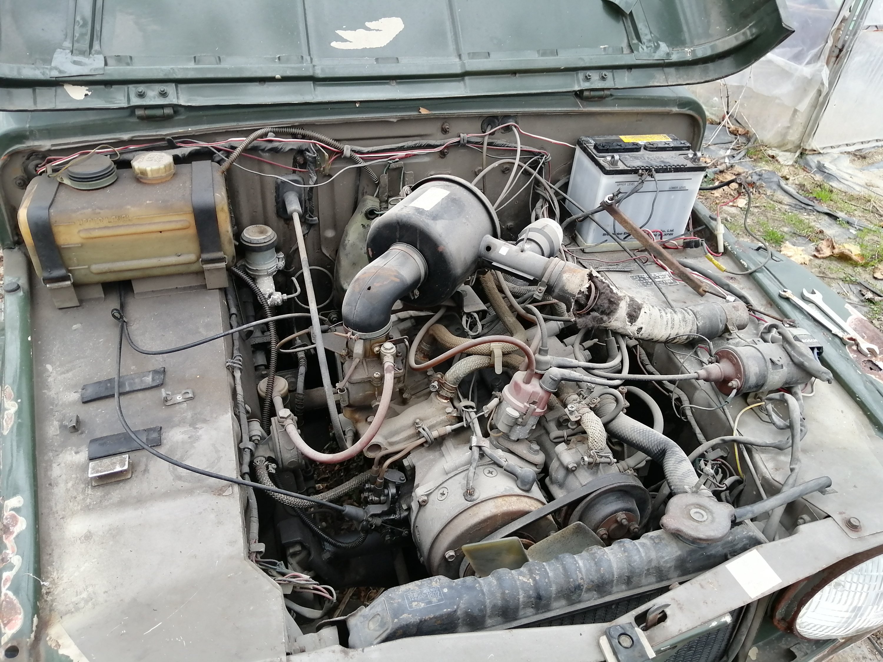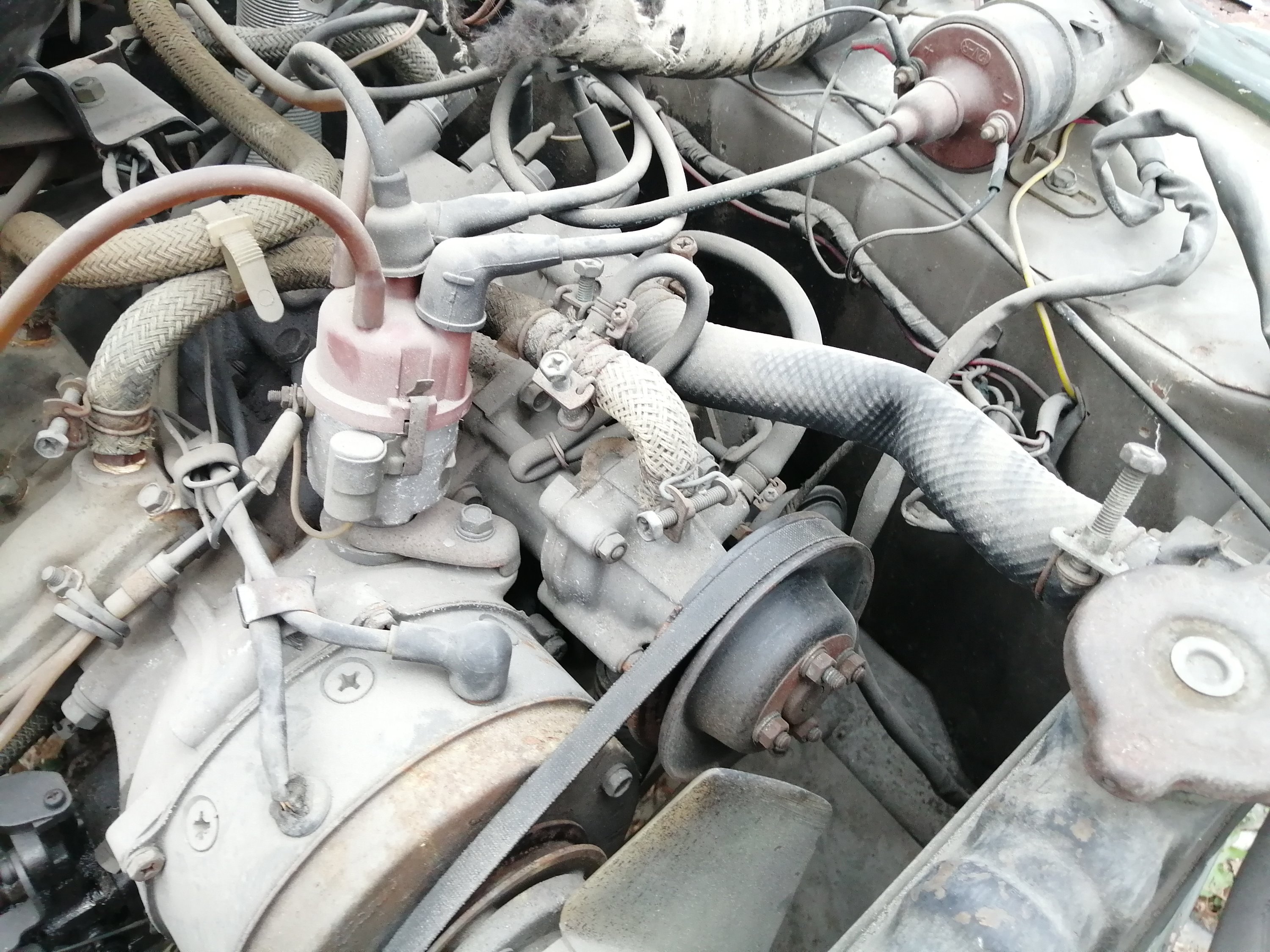 埃っぽいエンジンルームです。掃除しがいがありますね。このエンジン、シリンダーはすこし斜めっているのでしょうか?