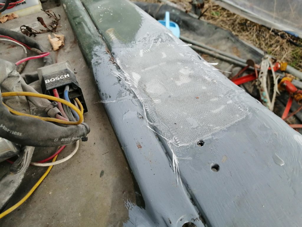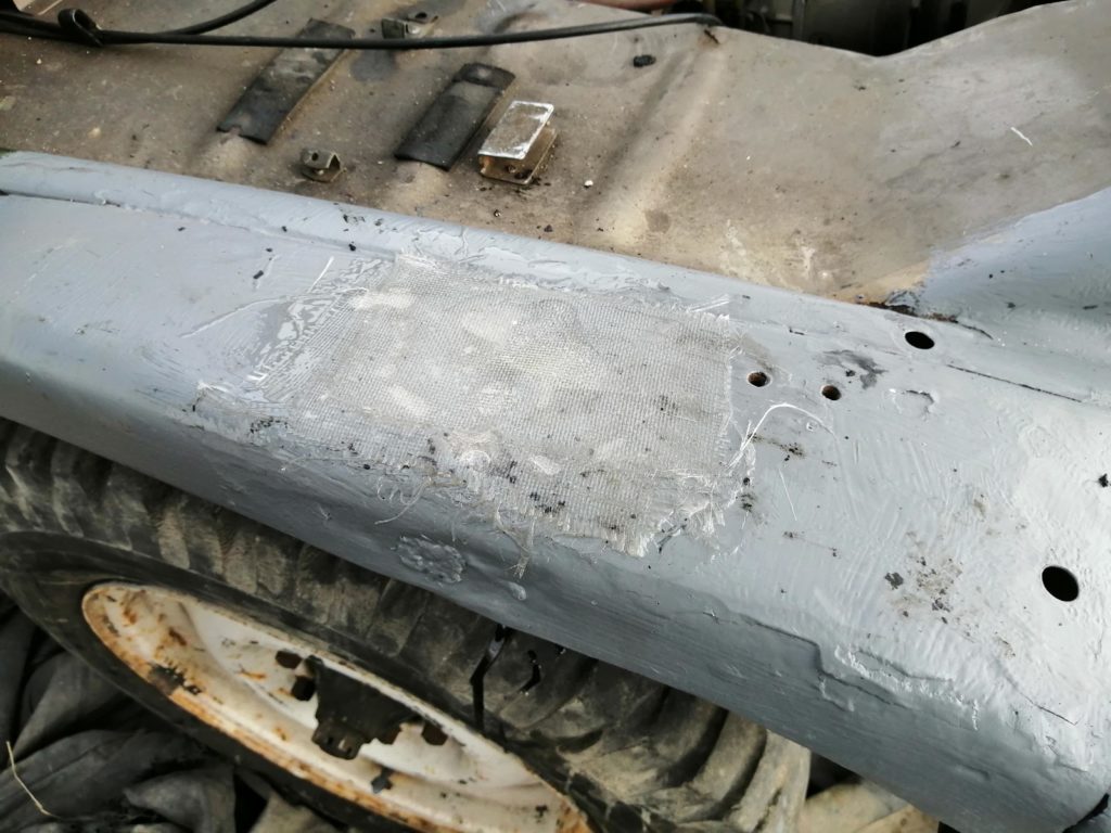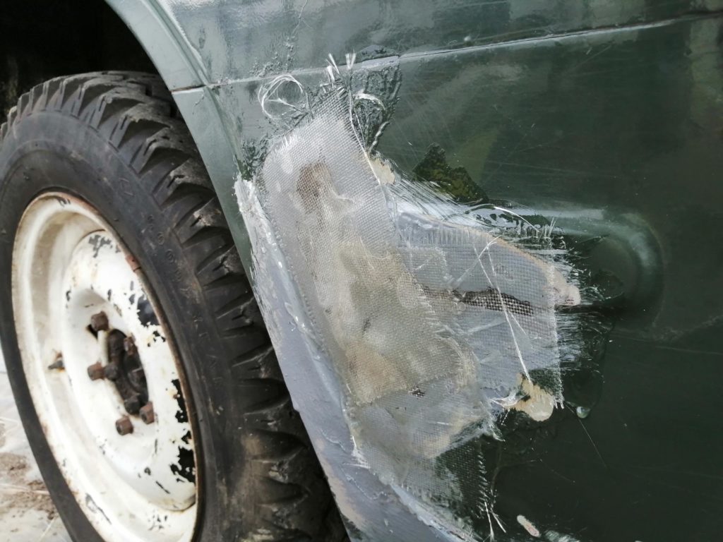 室内FRP貼ったところの補強と、フェンダーミラー元部の穴、それから外装の穴にペタペタと。