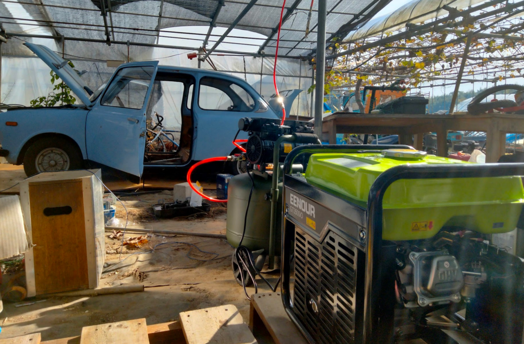 畑でガン塗装はあきらめていたのですが、この発電機をみつけて、活路が開きました。